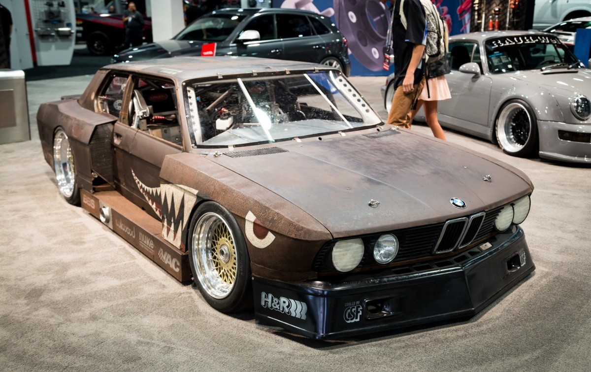 The BMW 5 Series E28 “Rusty Slammington” is in fact a rat-rod version of the same classic BMW. With a rear diffuser, side exhaust, huge wheel arches and a boxy wide body kit, “Rusty Slammington” is unmistakably a beast. The look of this E28 is wrapped by a set of BBS E57 rims wrapped in a set of thin tires. The rims complement the rest of the car through the brand new look and deep dish aspect. Mike Burroughs has even had time to add a WW2 bomber inspired decal which further gives this particular E28 style and personality.